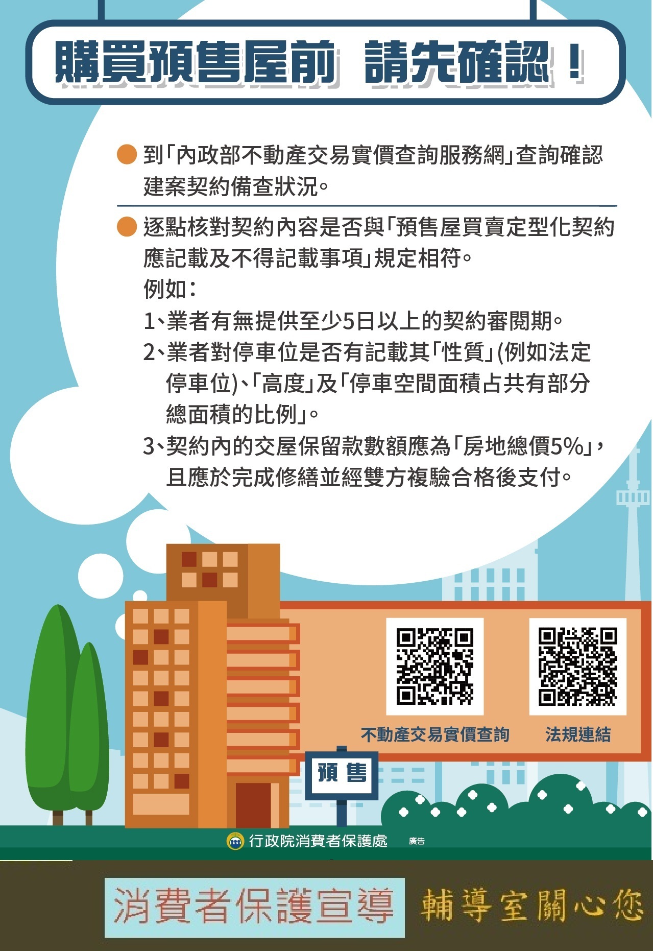 購買預售屋前,請先確認: 1.到「內政部不動產交易實價查詢服務網」查詢確認建築契約備查狀況。 2.逐點核對契約內容是否與「預售屋買賣定型化契約應記載及不得記載事項」規定相符。例如: (1)業者有無提供至少5日以上的契約審閱期。 (2)業者對停車位是否有記載其「性質」(例如法定停車位)、「高度」及「停車空間面積占共有部分總面積的比例」。 (3)契約內的交屋保留款數額應為「房地總價5%」,且應於完成修繕並經雙方複驗合格後支付。