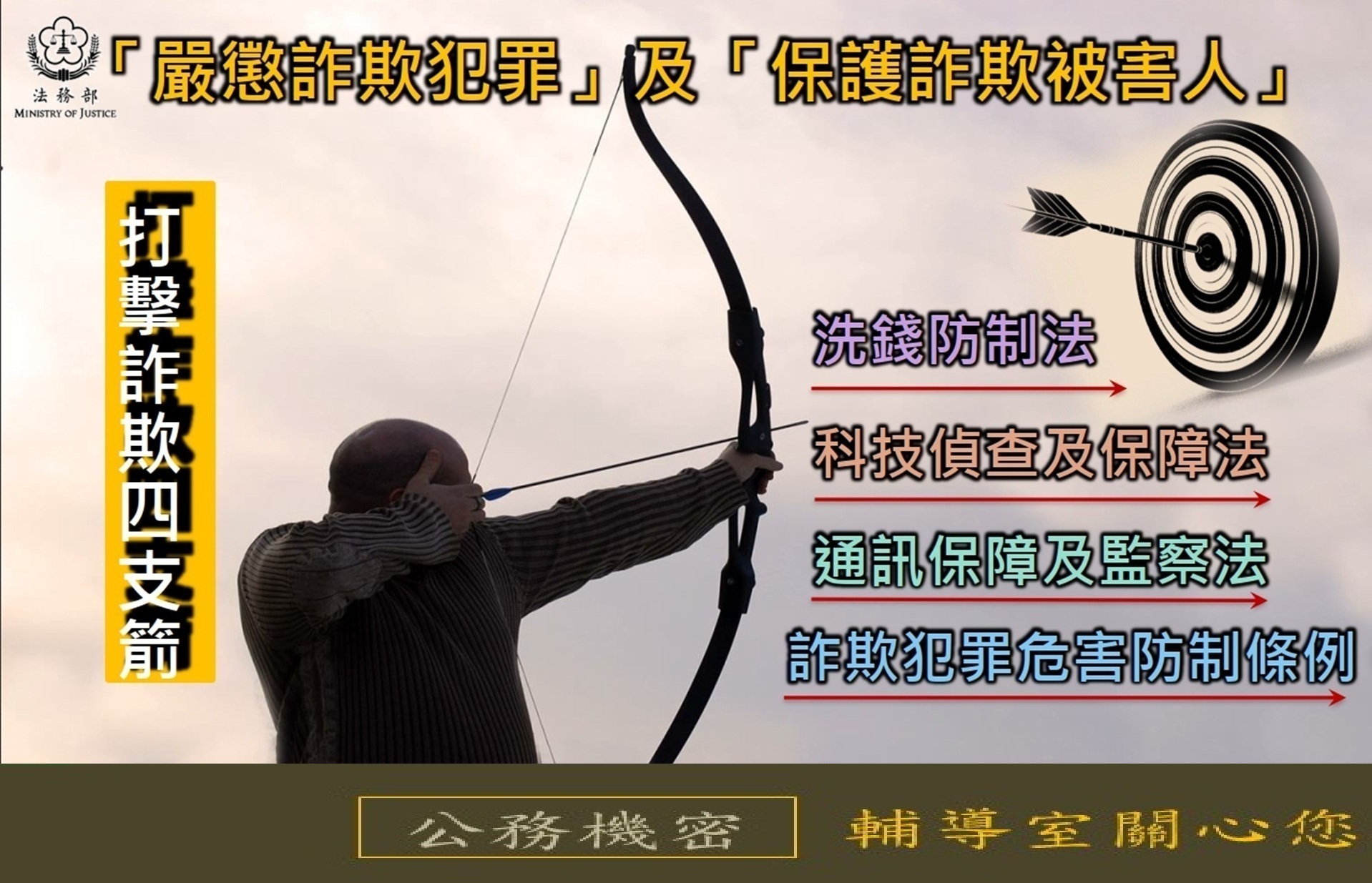「嚴懲詐欺犯罪」及「保護詐欺被害人」,打擊詐欺四支箭:洗錢防制法、科技偵查及保障法、通訊保障及監察法、詐欺犯罪危害防制條例。