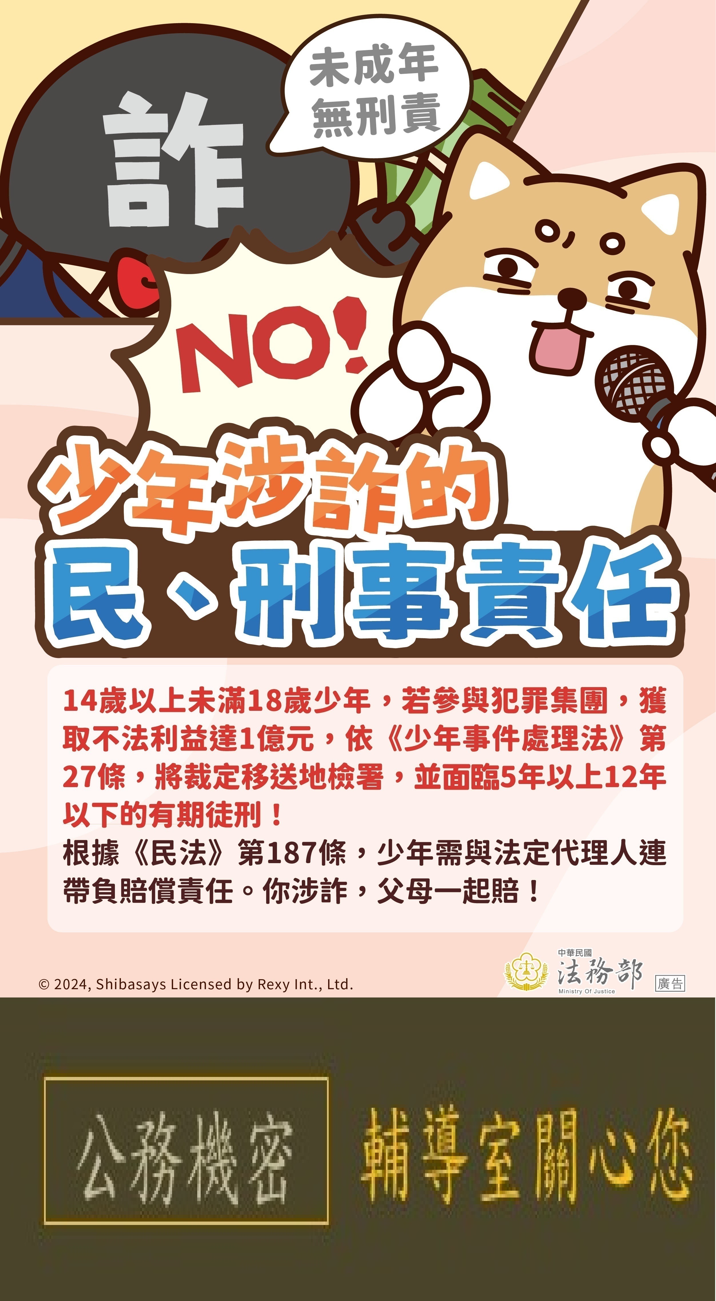 少年涉詐的民、刑事責任: 14歲以上未滿18歲少年,若參與犯罪集團,獲取不法利益達1億元,依《少年事件處理法》第27條,將裁定移送地檢署,並面臨5年以上12年以下的有期徒刑!根據《民法》第187條,少年需與法定代理人連帶負賠償責任。你涉詐,父母一起賠!